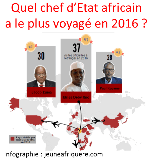 Depuis le 1er janvier 2016, il a effectué selon les calculs de Jeune Afrique l’équivalent de 5,4 fois le tour de la Terre, soit un peu moins de 220 000 kilomètres cumulés, en 37 visites officielles à l’étranger (sans même compter les séjours privés, donc). »