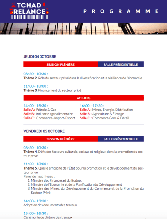 La contribution du secteur privé à la relance économique au Tchad est le thème du forum Tchad Relance qui se tiendra du 2 au 5 octobre 2018 au Palais du 15 janvier à N’Djaména.