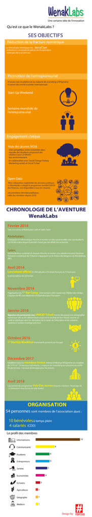 J’aurai le temps d’aborder tous ces sujets dans l’avenir. Mais pour le moment je vous présente en infographie ce qu’est le WenakLabs : ses objectifs, ses membres, son siège et son évolution depuis 5 ans.