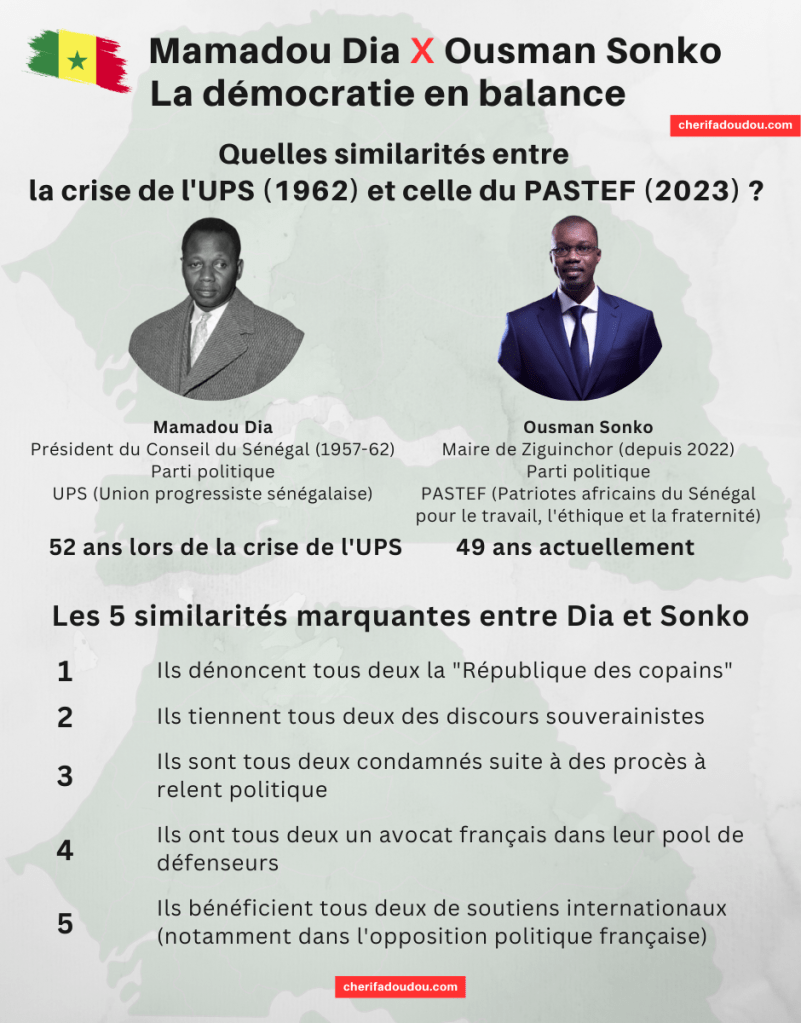 Quelles sont les similarités entre ces deux périodes de tensions politiques, sachant que l’évolution des évènements de 2023 ne sera en rien identique à celle de 1962 ? Les revendications d’Ousmane Sonko, ses actions et l’acharnement dont il fait l’objet sont en tout point identiques à ceux qu’a vécu il y a 61 ans Mamadou Dia.