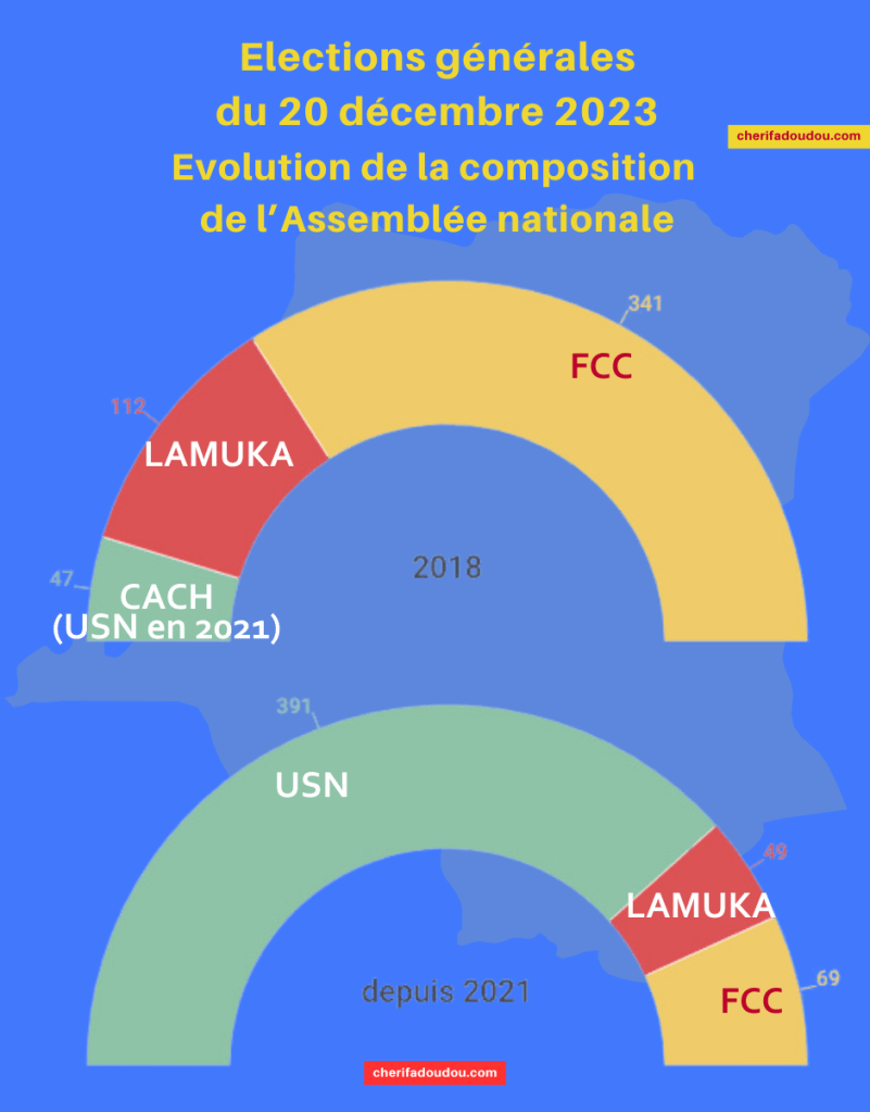 La situation actuelle est la suivante : L’USN compte (au gré donc des alliances et mésalliances rencontrées depuis le début de cette IIIème législature en 2018) 391 sièges sur les 500 de la chambre basse. Le FCC (Front commun pour le Congo) créé en 2018 par l’ancien président Joseph Kabila et la coalition Lamuka rassemblée autour de Martin Fayulu occupent respectivement 69 et 40 sièges.